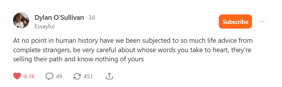 I’ve been reading online content across SM platforms since high school. There was a time when every alternate article or post would be well-researched, well-written, and insightful. Nowadays it’s hard to come across something that’s novel, something that stirs your mind. If you scroll for > 10 minutes on any platform, everything starts to sound the same. I don’t know if it’s a quality decline problem, or a content oversaturation problem, or both.